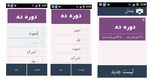 شاید برای شما هم پیش آمده باشد که در مسافرت هایی که رفته اید برخی از وسایل مورد نظر خود را فراموش کرده باشید که به همراه خود ببرید. نرم افزار چمدان برای مدیریت و برنامه ریزی وسایل مسافرت تهیه شده است و می تواند راهنمای مناسبی برای سفر باشد. این نرم افزار Checklist می تواند گزینه ای مناسب برای سفرهای نوروزی باشد تا دیگر چیزی را فراموش نکنید. شما می توانید در این نرم افزار اطلاعاتی مانند: وسایل مورد نیاز، راهنمای مسافرت، هزینه ها و ... را ثبت کنید تا در هنگام مسافرت برنامه به شما اطلاع رسانی کند. از ویژگی های نرم افزار می توان به مواردی چون: محیط کاربری زیبا، وجود تقویم شمسی، امکان یاد آوری آیتم با هشدار دلخواه و ... اشاره کرد.